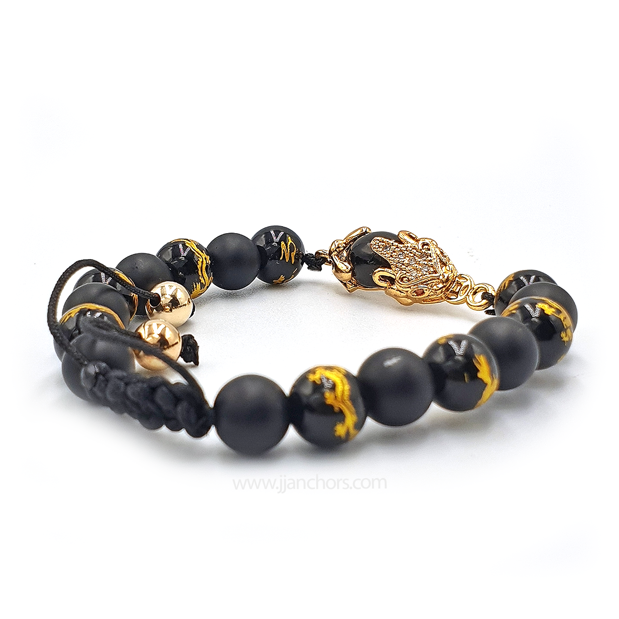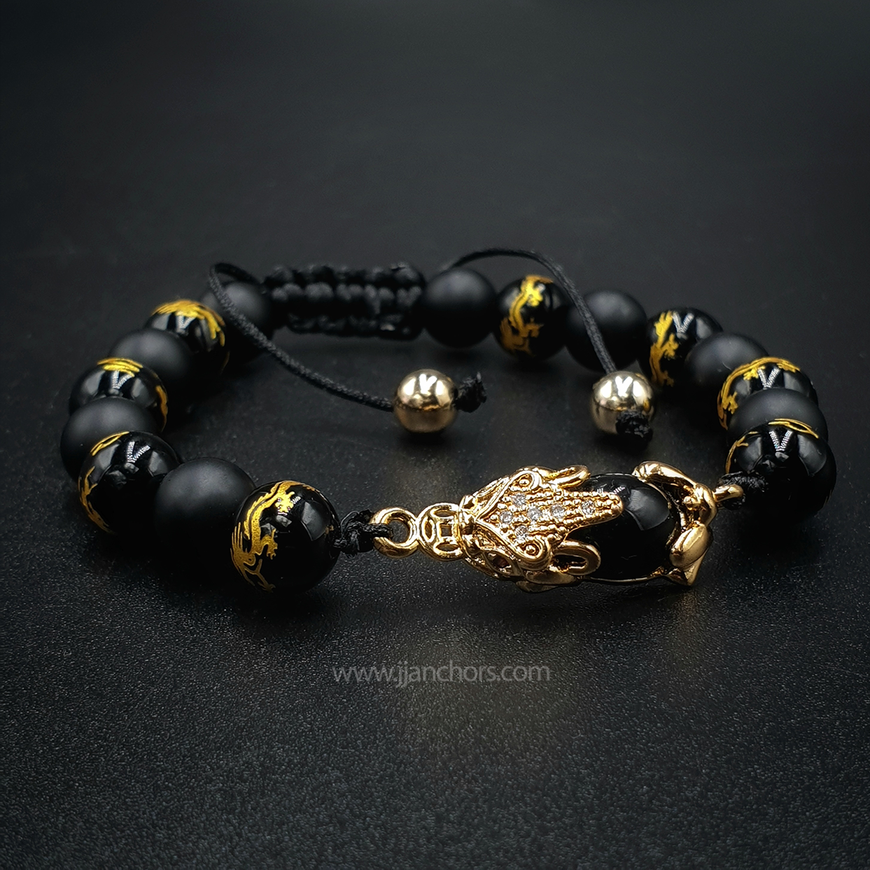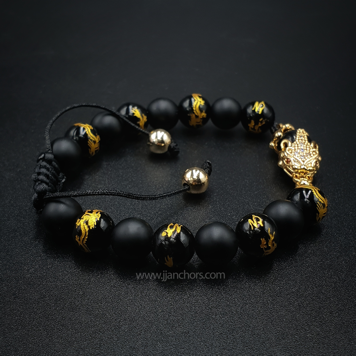 A MUST HAVE for businessmen and people who want MONEY to come in. Pi Yao can often be seen in banks, casinos, foreign exchange markets, and finance companies in Oriental countries. This adjustable bracelet has alternating matte Black Onyx stones and shiny Black Obsidian etched with Dragon Mantra symbols. It is centered with Piyao catching a fortune coin and carrying black onyx stone for protection.