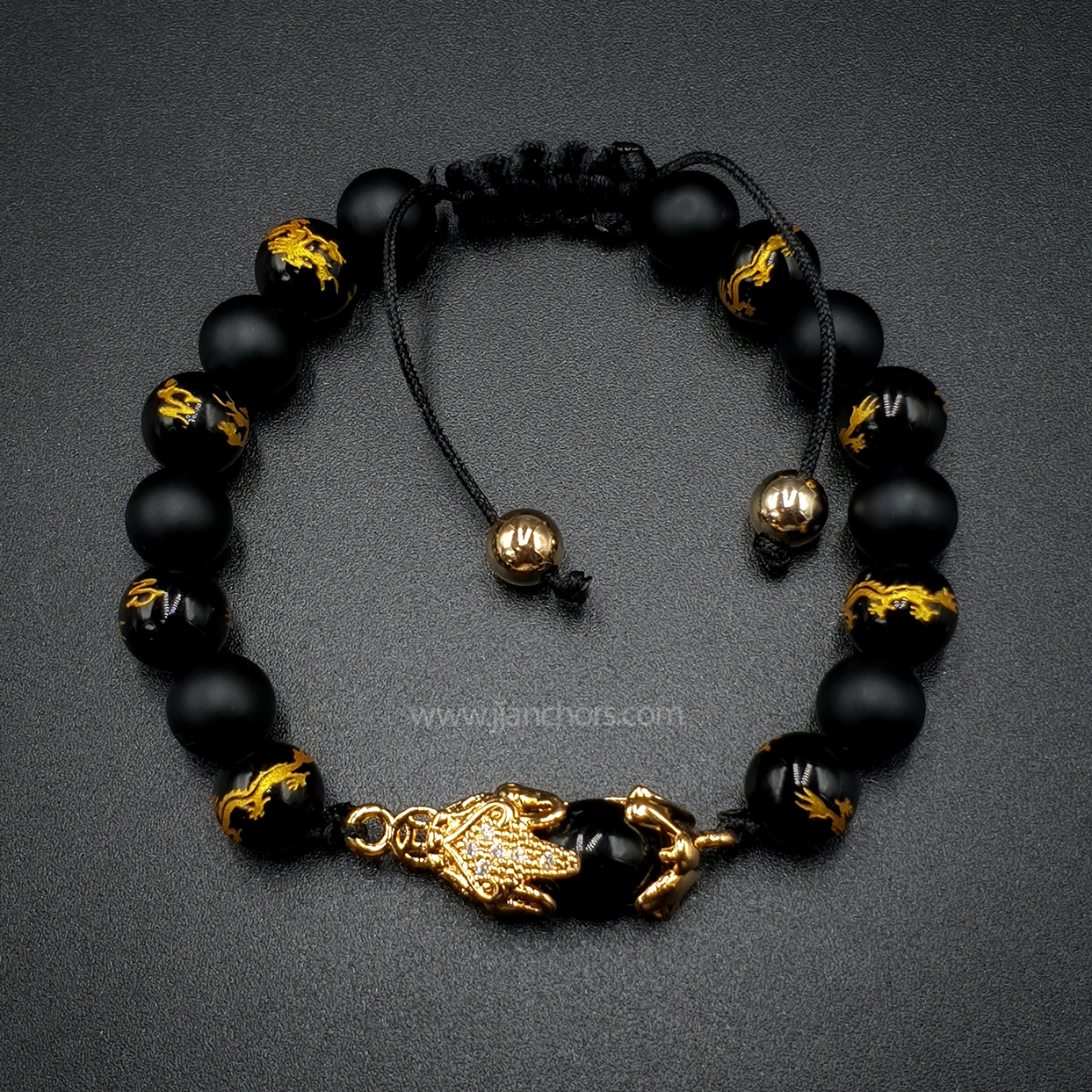 Black Money Catcher PiYao Bracelet with 12K Gold & Dragon Mantra
