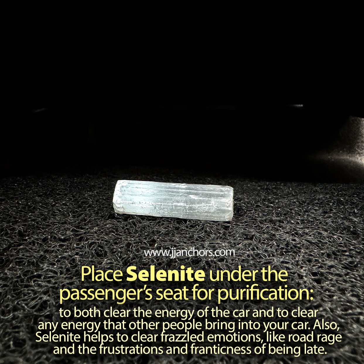 - Place Selenite under the passenger’s seat for purification: to both clear the energy of the car and to clear any energy that other people bring into your car. Also, Selenite helps to clear frazzled emotions, like road rage and the frustrations and franticness of being late.