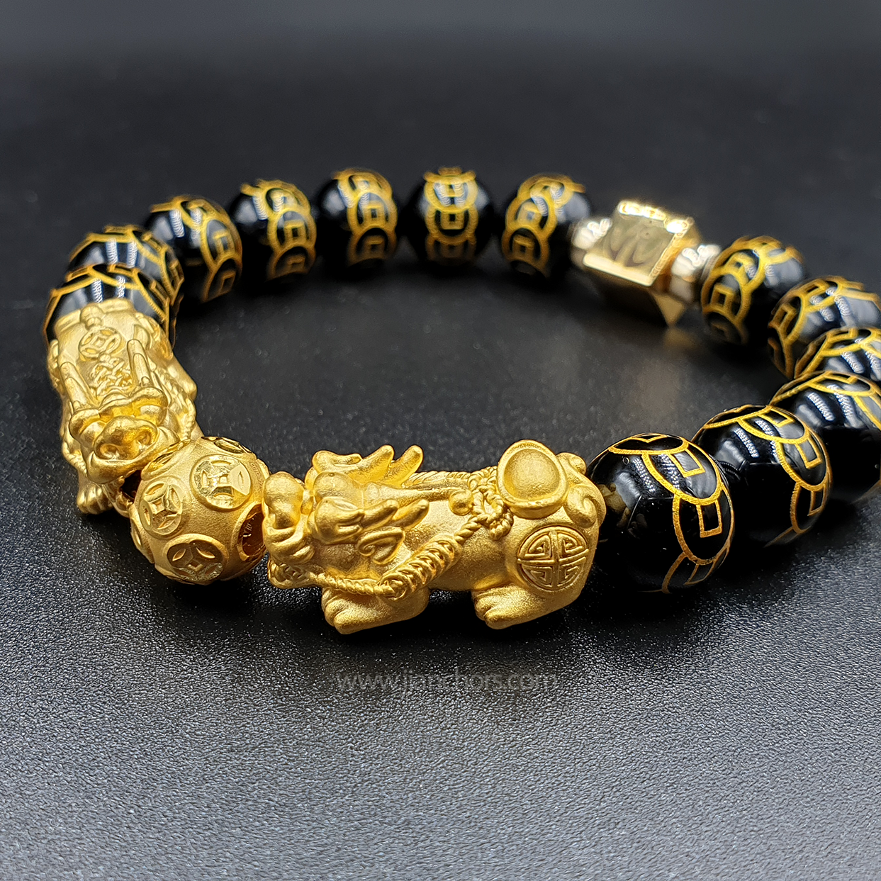 This 24 karat gold Double Lucky PiYao 🐉🐲 bracelet is made from genuine Black Obsidian etched with 9 Emperor coins. The centerpiece Double Piyao + Money Ball is pawnable authentic yellow gold. This high quality bracelet is a suitable gift for executives, directors and business associates.