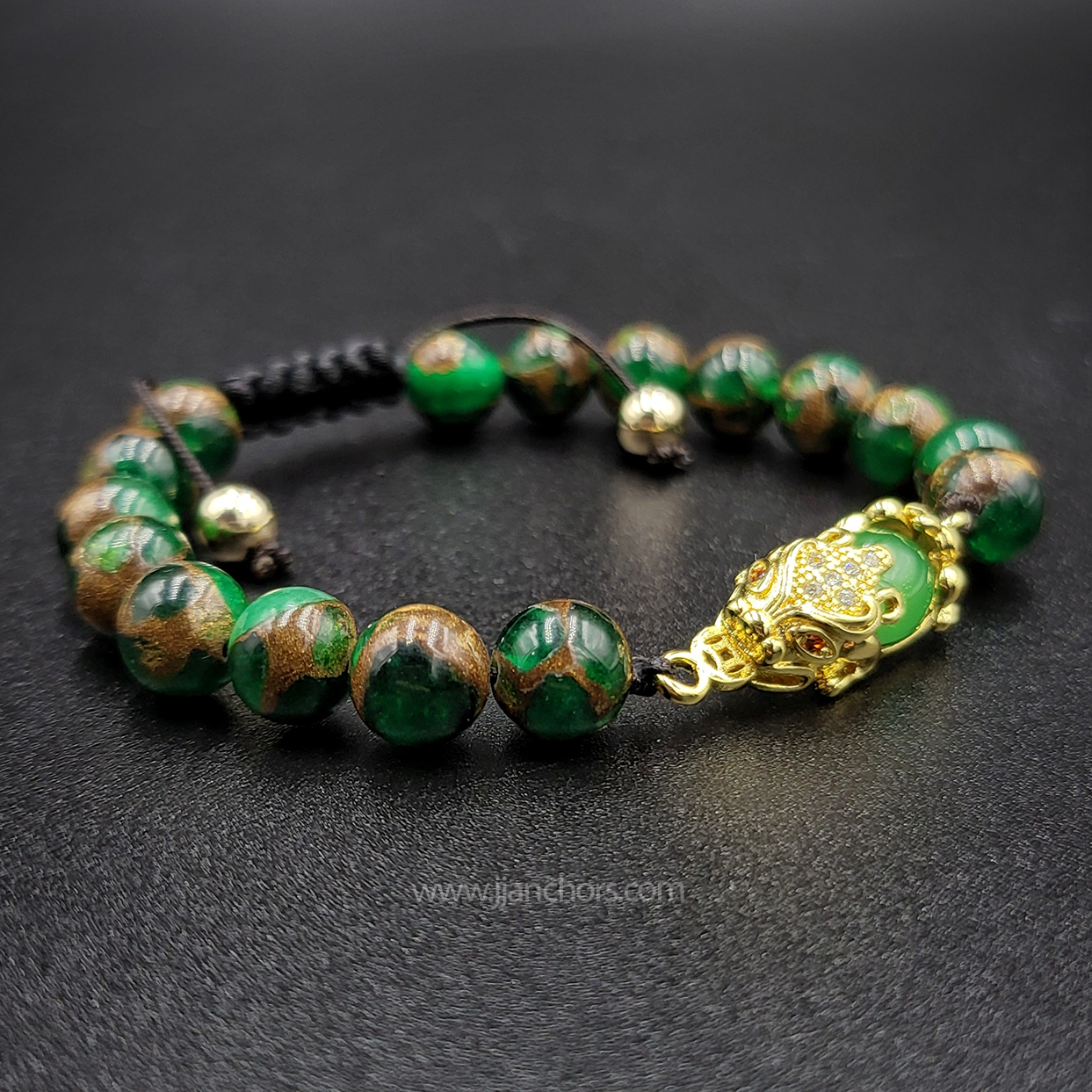 A MUST HAVE for businessmen and people who want MONEY to come in. Pi Yao can often be seen in banks, casinos, foreign exchange markets, and finance companies in Oriental countries. This adjustable bracelet has Muzo Emerald stones for balance of finances, love and hope. It is centered with Piyao catching a fortune coin and carrying Myanmar Green Jade stone for abundance and prosperity.