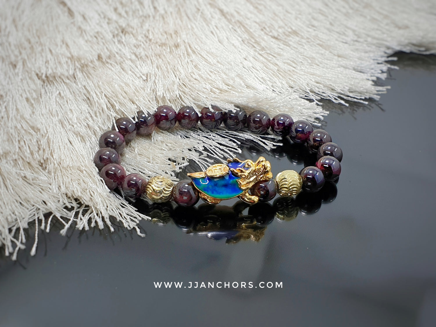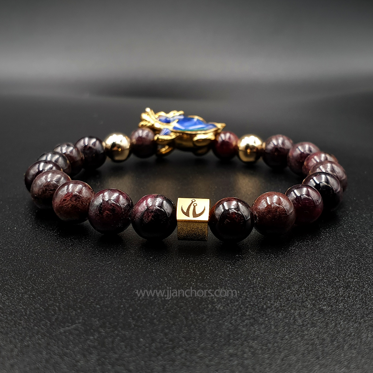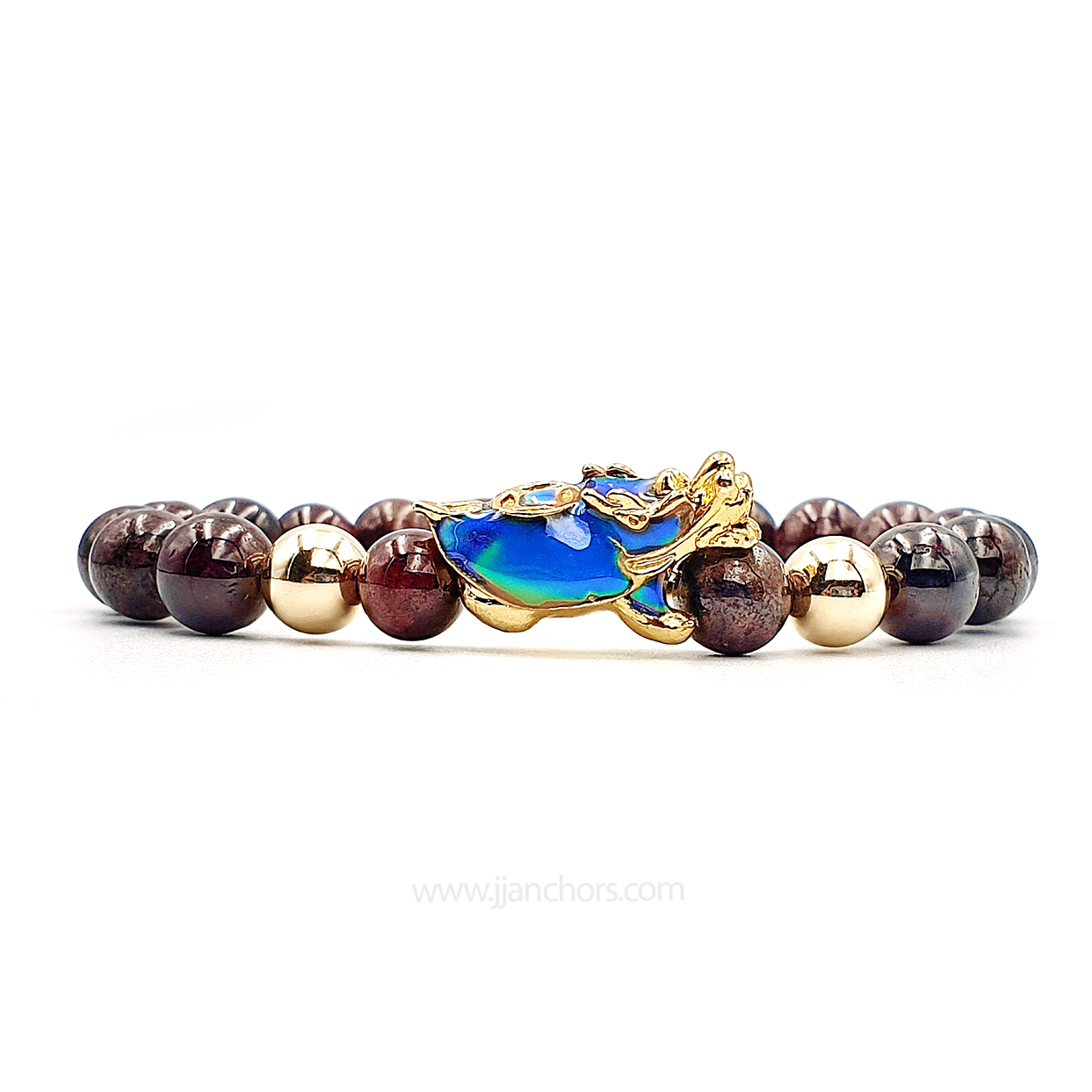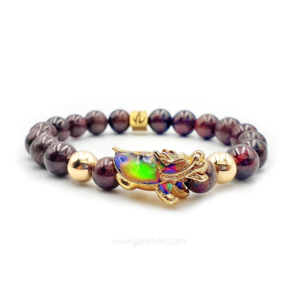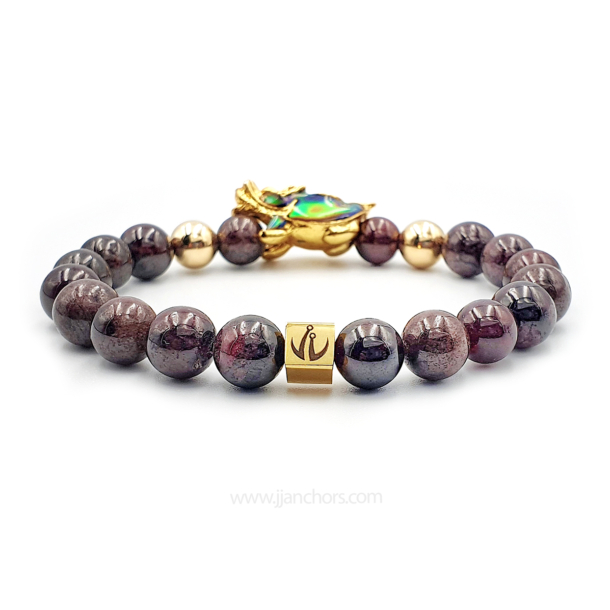 - Hardware: 10mm USA Gold-filled bead (India) and 14k gold coated sterling silver Dragon Tortoise with thermochromic coat from Tibet, China. JJ Anchors branding titanium bead.