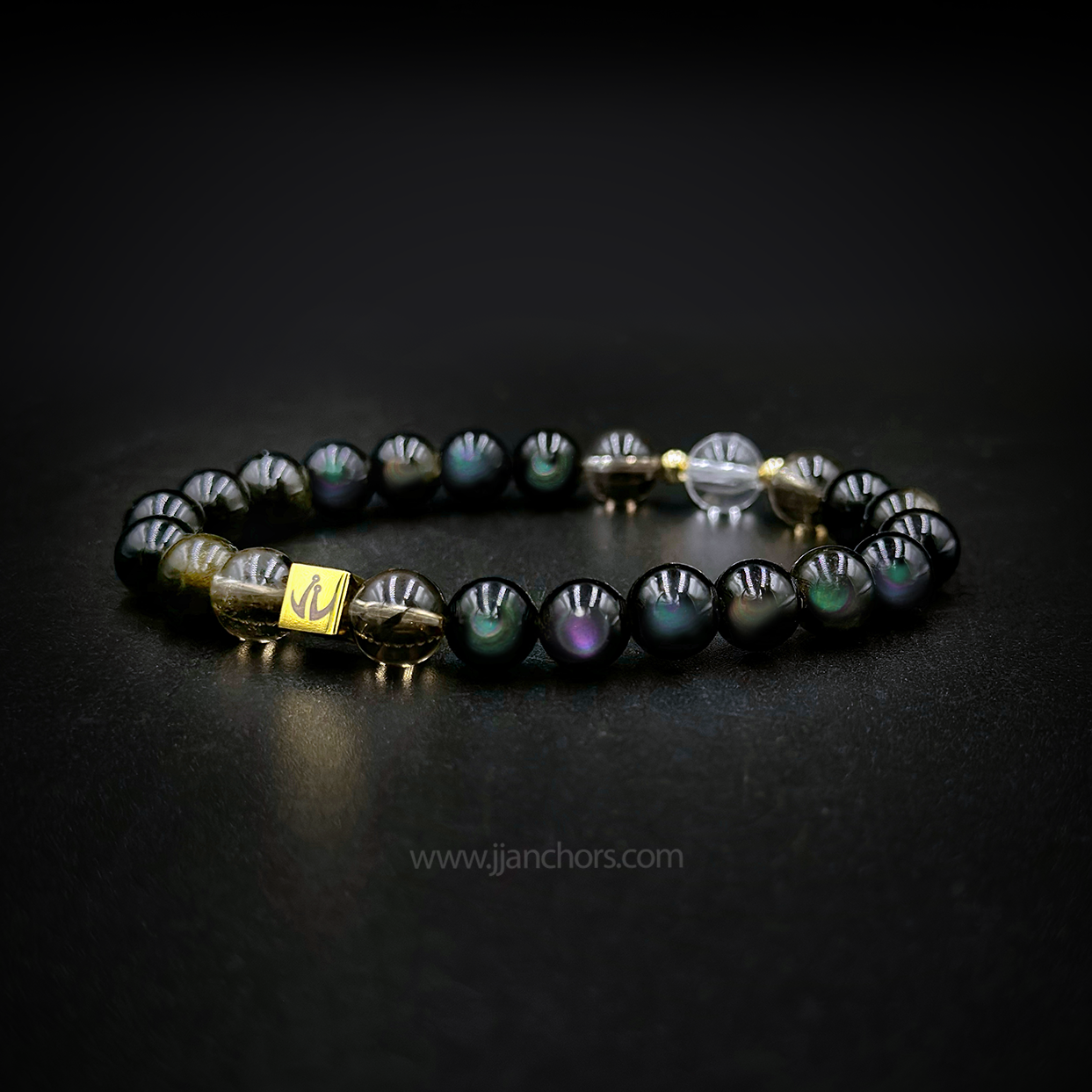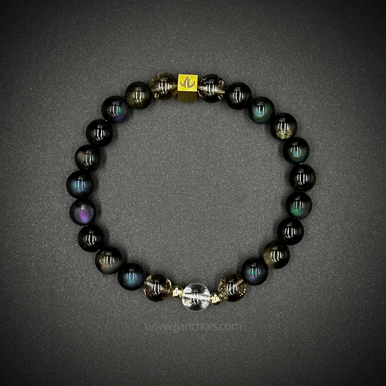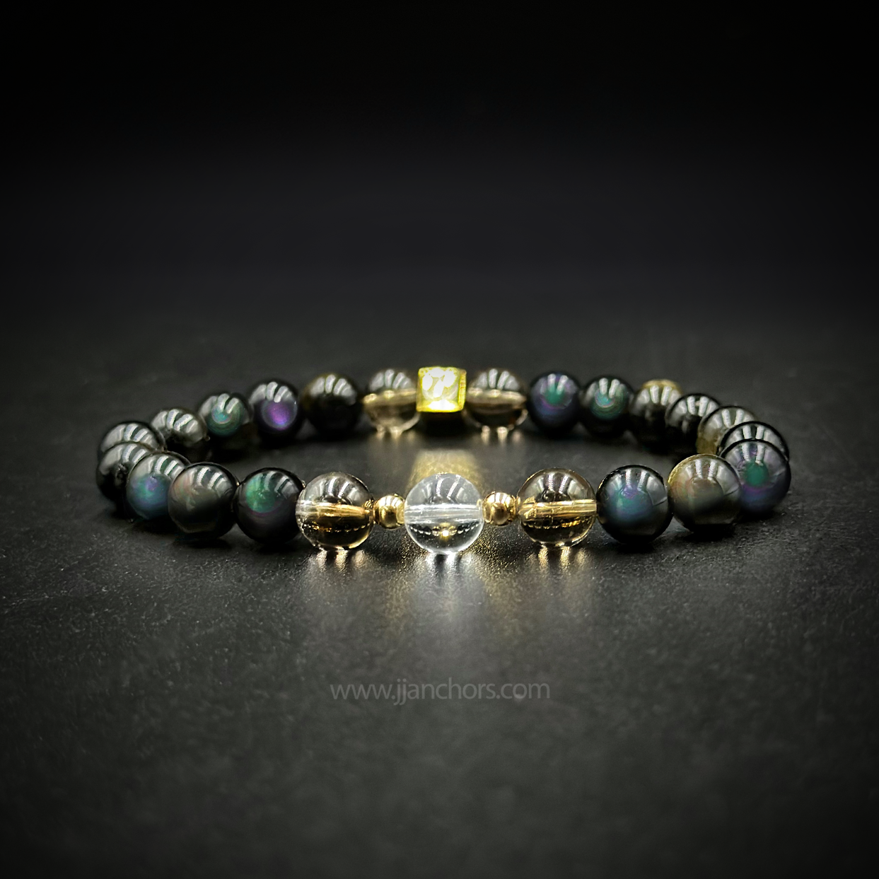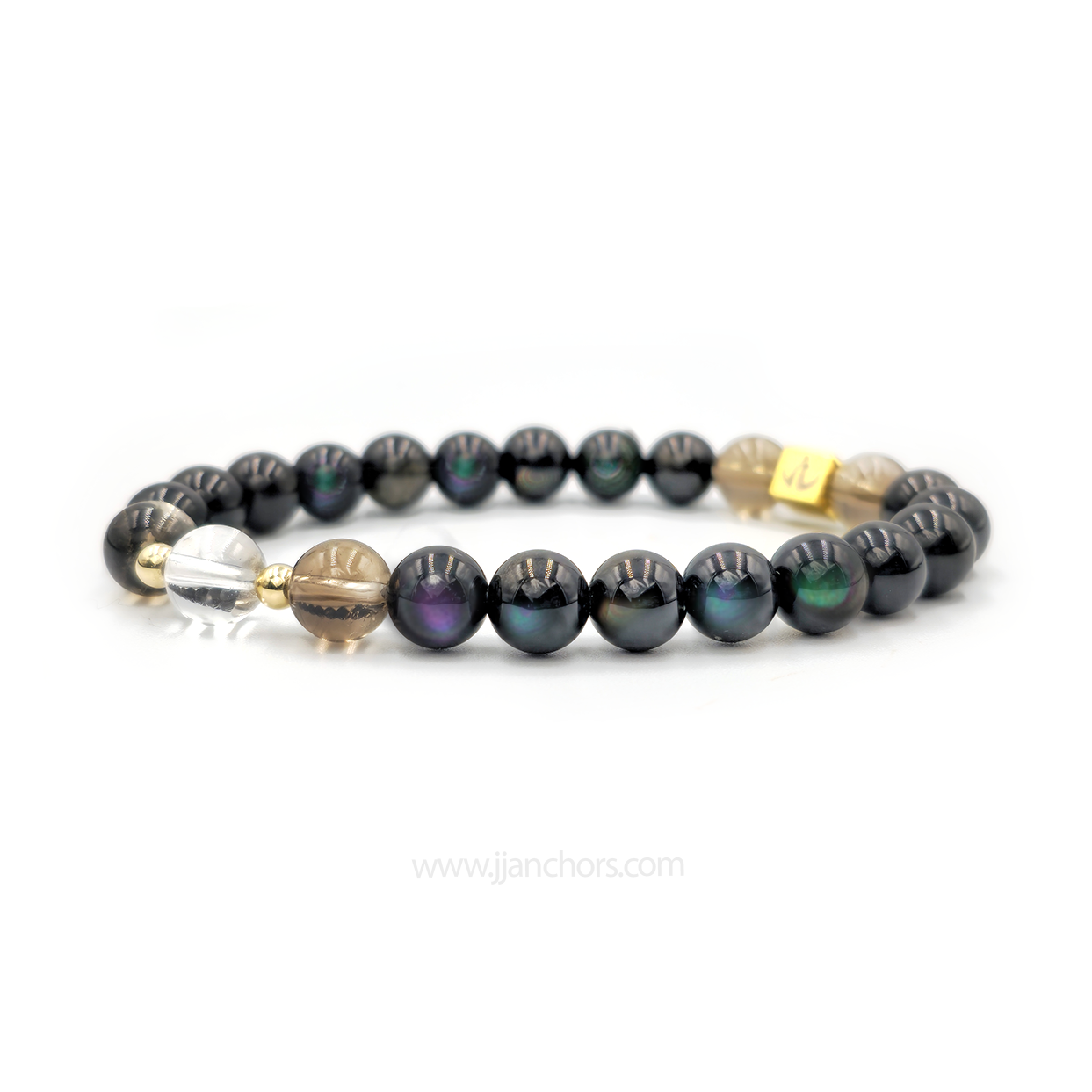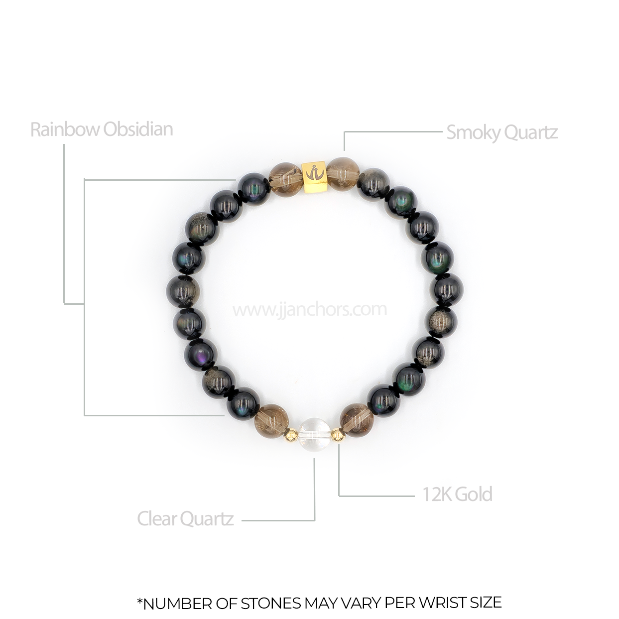 All crystals in our Moving Through Bracelet - Rainbow Obsidian, plus 2 Smoky Quartz and clear quartz beads - will vary slightly in size, shape, color and pattern.