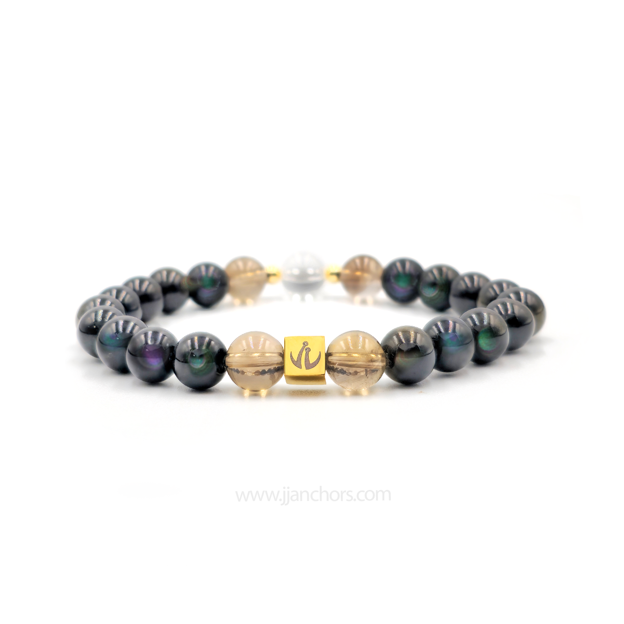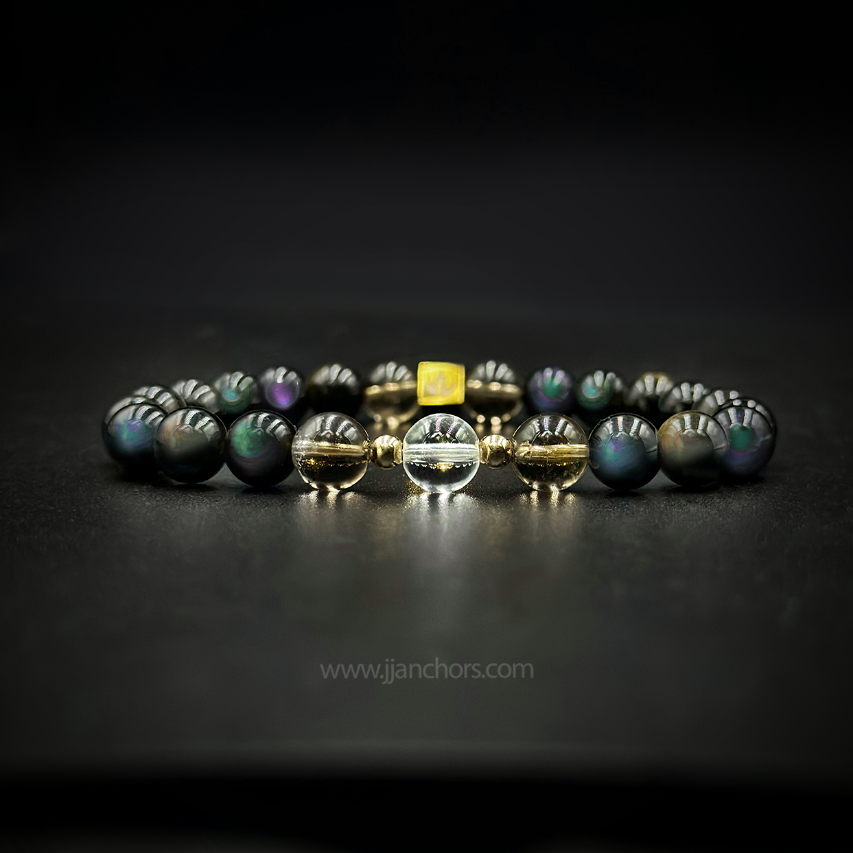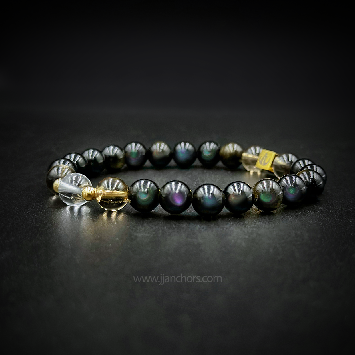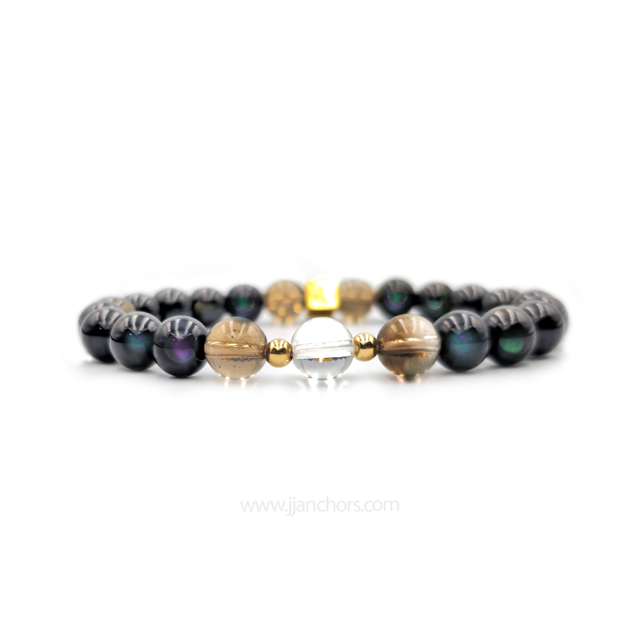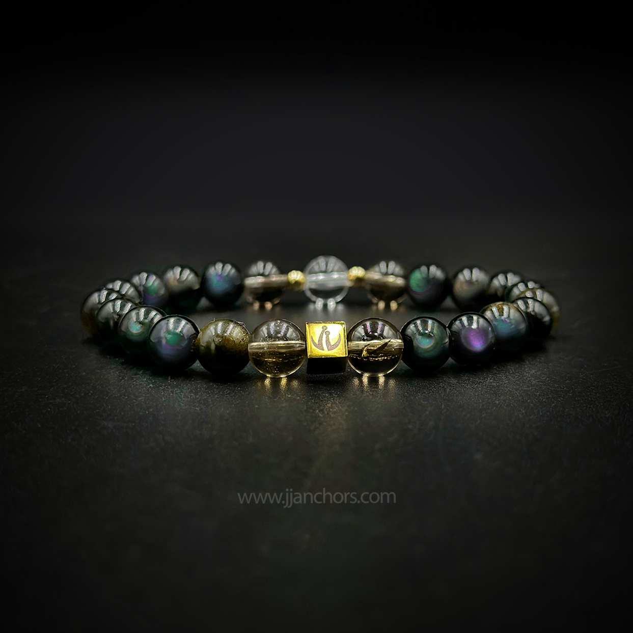 All crystals in our Moving Through Bracelet - Rainbow Obsidian, plus 2 Smoky Quartz and clear quartz beads - will vary slightly in size, shape, color and pattern.