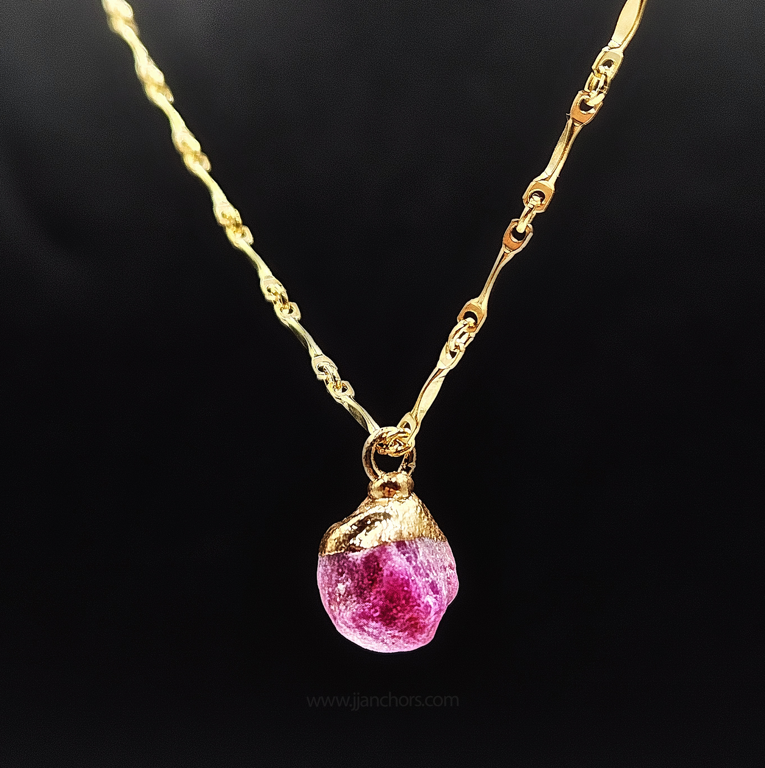 Our pendant necklace is meticulously crafted to accentuate the raw beauty of Indian Ruby, flawlessly paired with an intricately designed 10k gold dapped bar chain. The result is an accessory that effortlessly transitions from bold statements to sophisticated glamour, enhancing every ensemble with its timeless allure.